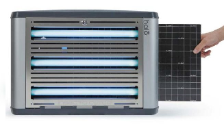 Flies are attracted by the UV tubes and are zapped by a high voltage and caught in a tray. |
